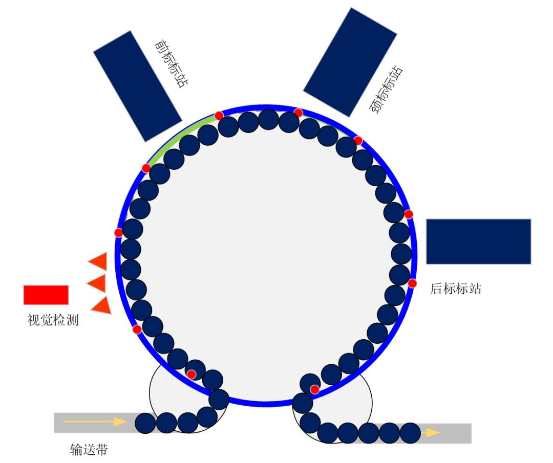 圖1是回轉(zhuǎn)貼標機的機械示意圖,它由大圓盤及在其上的托盤、標站構(gòu)成,整個托盤圍繞著圓盤旋轉(zhuǎn),而貼標站可以多個,并且可以是冷膠、熱熔膠、不干膠的多種形式,可以自由組合配對—根據(jù)貼標本身的需求。