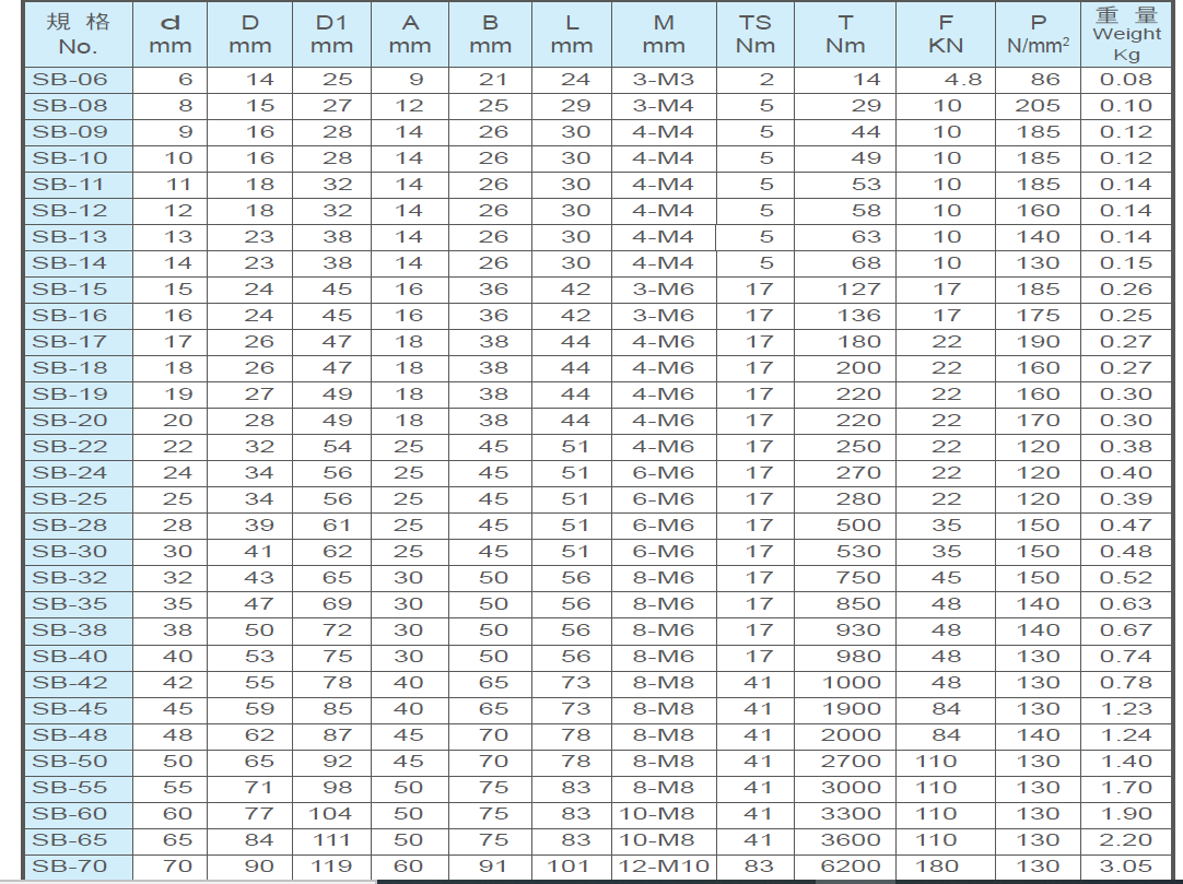 仕勛SB-18 SB-20 SB-22免鍵式軸套 軸環(huán)使用上的注意事1 所需傳動扭力的確認(rèn)2 軸與孔的加工精度要求3 同心度的要求4 是否有防銹的需求以上為一般注意事項(xiàng),若有特別需求,請與我們聯(lián)絡(luò)