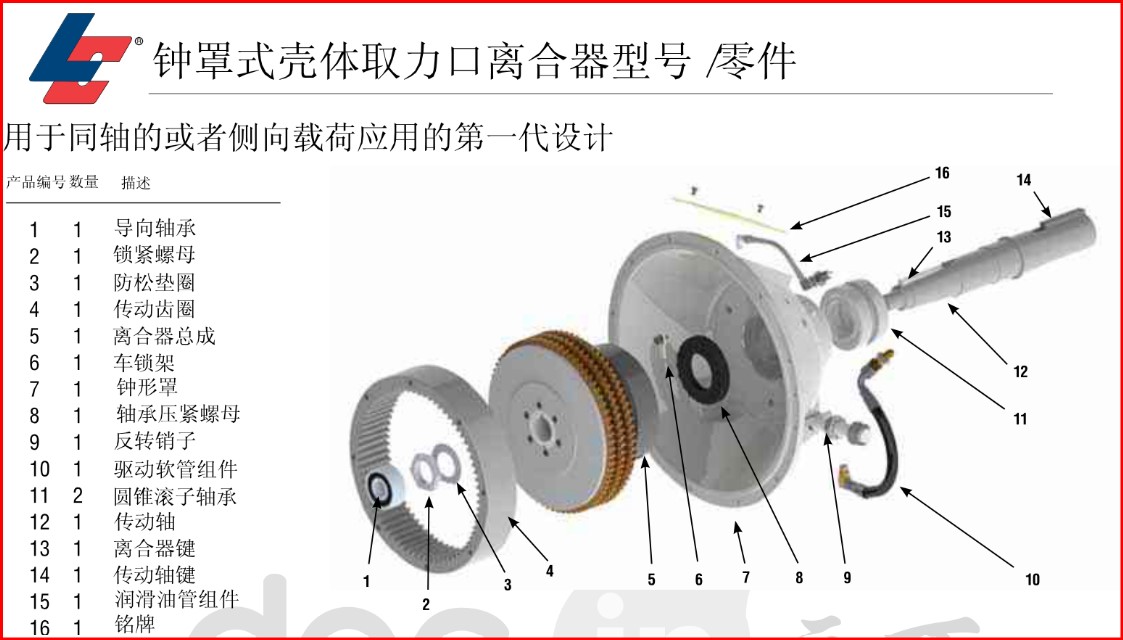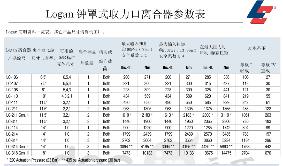 Logan氣/液驅動 鐘罩式殼體取力口離合器式自調(diào)節(jié)的,設計成直接安裝到柴油發(fā)動機或者汽油發(fā)動機的飛輪上。摩擦圓盤組為干式應用設計。通過一個固定的缸套-活塞布置或者通過內(nèi)置軸和離合器油道來完成。離合器的傳動軸通過內(nèi)孔或鍵槽來安裝。扭矩從盤片組傳遞到安裝在發(fā)動機飛輪上的齒輪傳動齒圈上。Logan離合器主杠加壓, 推動活塞夾緊或鎖住摩擦片或分離鋼片。當壓力移走, 回位彈簧使摩擦片和鋼片分離, 當鋼片和摩擦片分離后, 可以保持運行間隙。